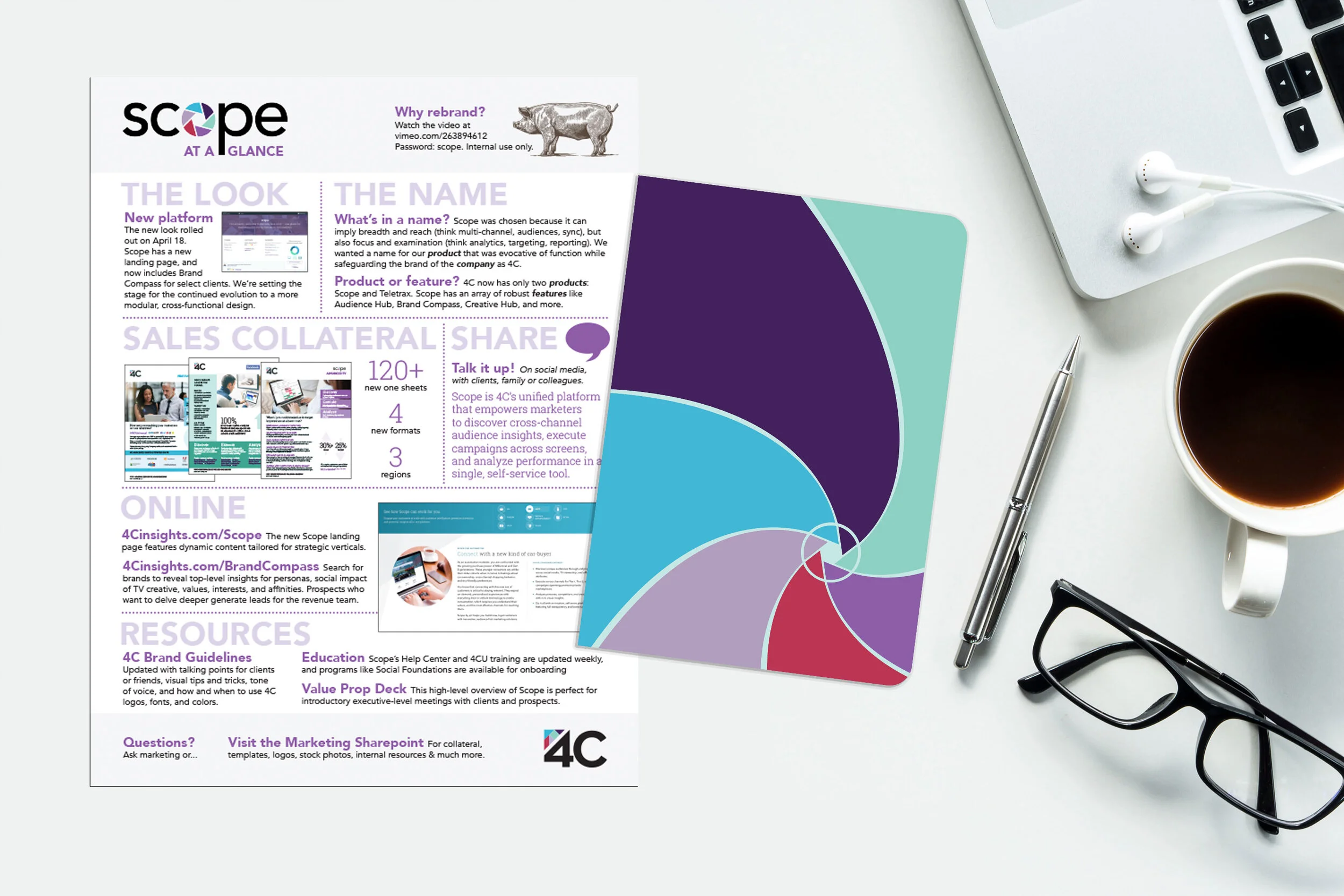 in 2018, the marketing technology created by 4C shared its name. Taken from the airplane seat where two of the original founders met, it provoked questions like, “What do the four C’s stand for?” The push to unify separate products and create an interoperable system opened the door for a new brand that would evoke the product functionality and distinguish it from the corporate identity. The name Scope suggests breadth and reach (cross-channel marketing activation at scale) as well as focus and examination (intelligence and analytics). After a campaign of consensus building, lots of focus groups (no, Stacey, you can’t make the O look like a gun sight), and multiple iterations, the new identity was launched.